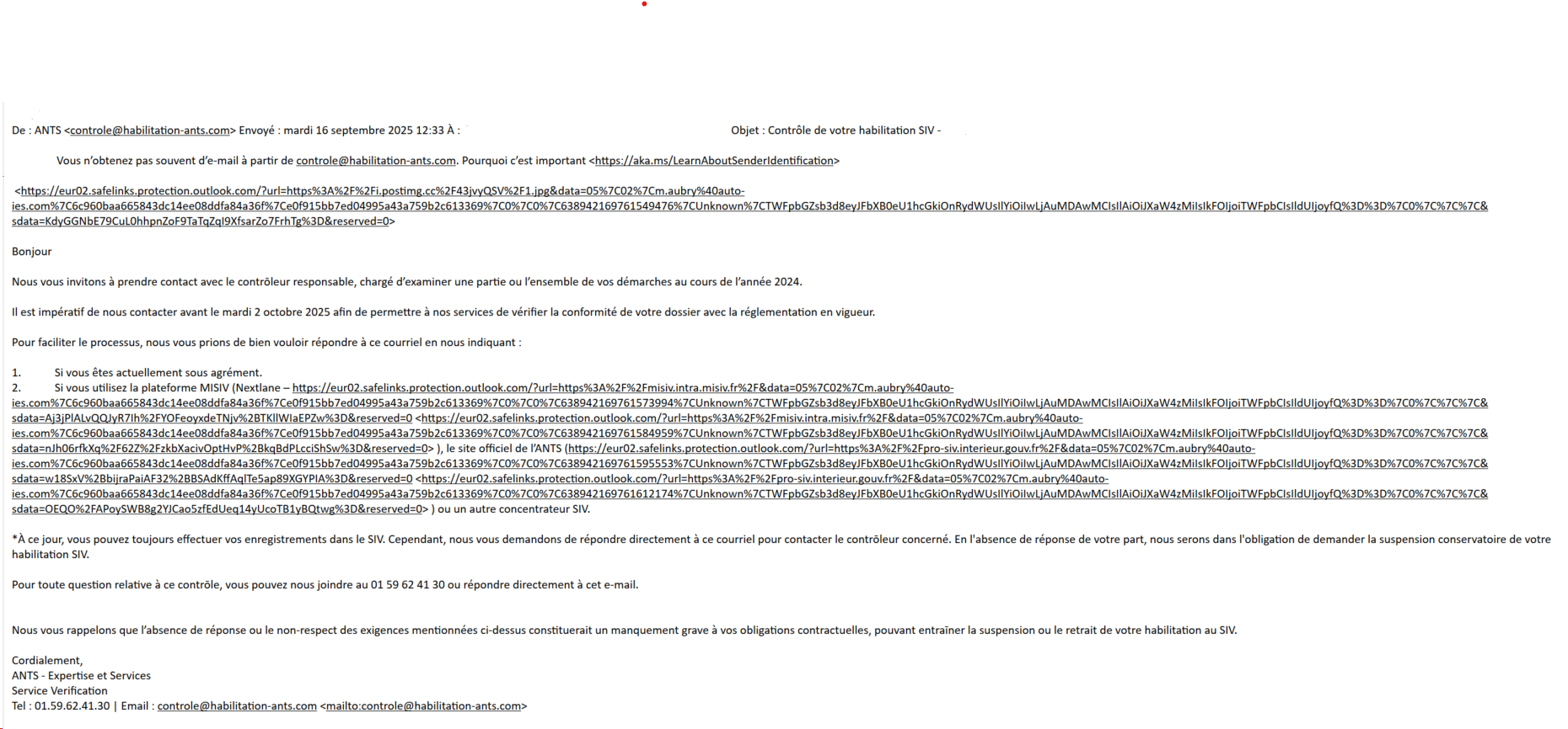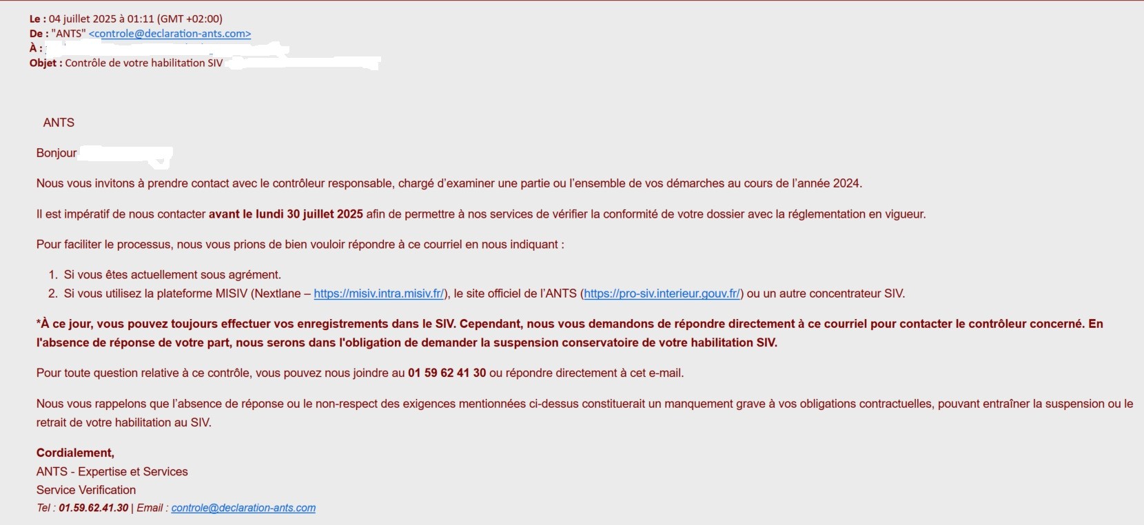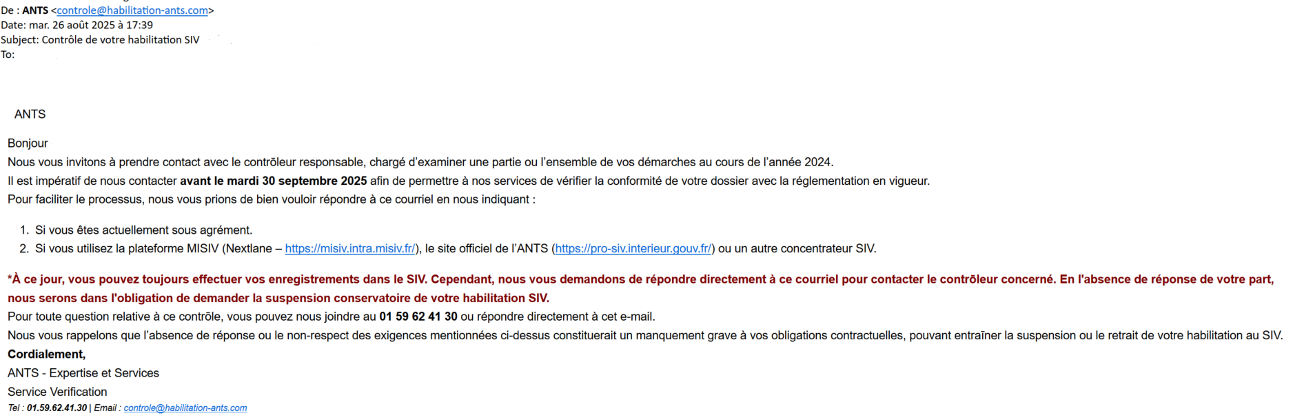 Nous avons identifié un émail frauduleux, intitulé « Contrôle de votre habilitation SIV » depuis le 01/07/2025. L’adresse de l’expéditeur est : controle@declaration-ants.com .