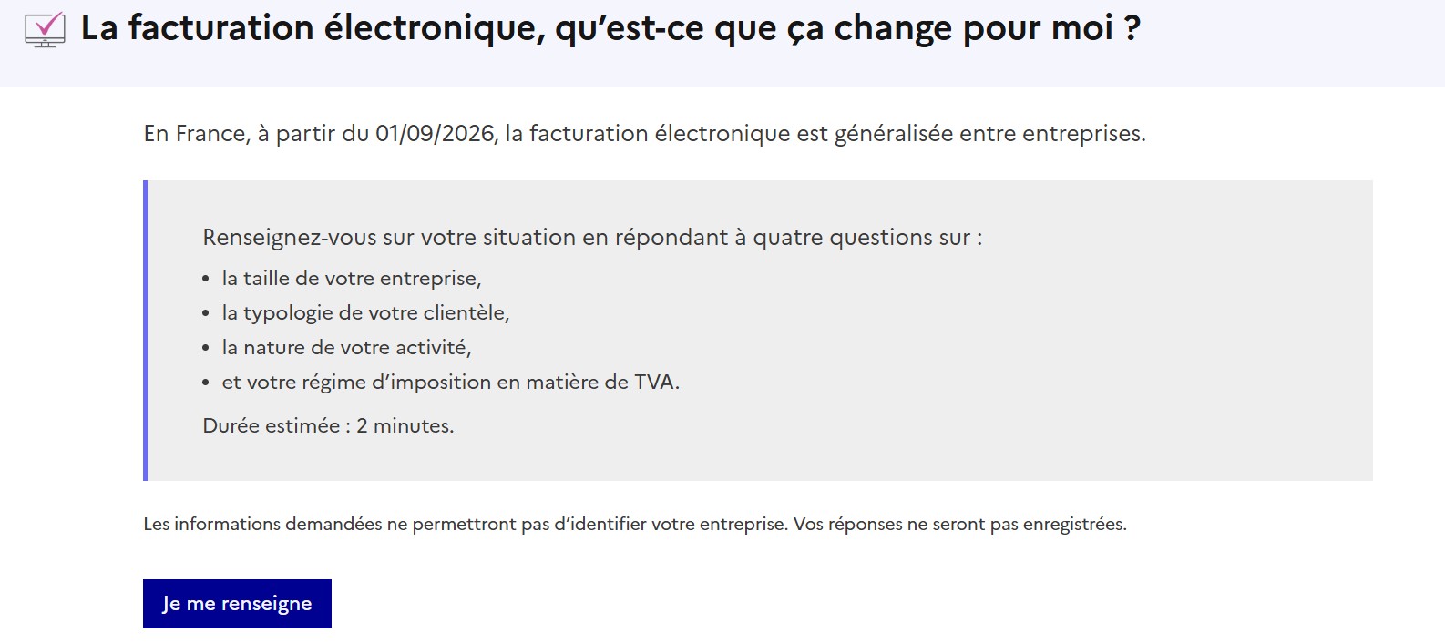 ⇒ N’hésitez pas à le consulter, cet espace vous propose un logigramme sur la facturation électronique en 4 questions afin de vous guider au plus près de la situation de votre entreprise.