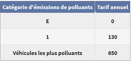 Le tarif annuel de la taxe sur les émissions de polluants atmosphériques est déterminé fonction de l’appartenance du véhicule à l’une des trois catégories d’émission de polluant:
