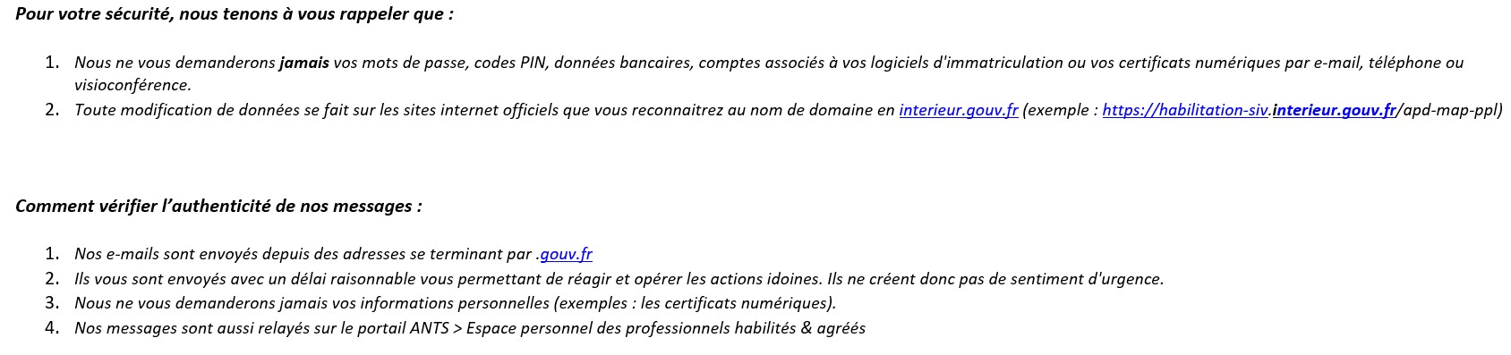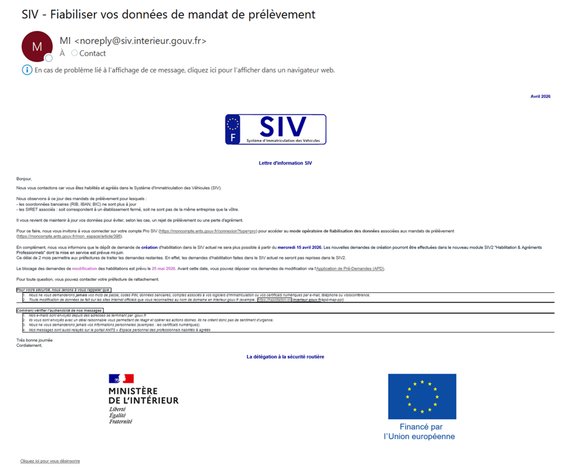 A ce titre, les professionnels habilités et agrées ont reçu un mail en provenance de l’adresse noreply@interieur.gouv.fr dont l’objet est « SIV – Fiabiliser vos données de mandat de prélèvement » et ont été nombreux à solliciter la FNA et ses groupements de proximité afin de savoir si cette communication était une tentative de hameçonnage.