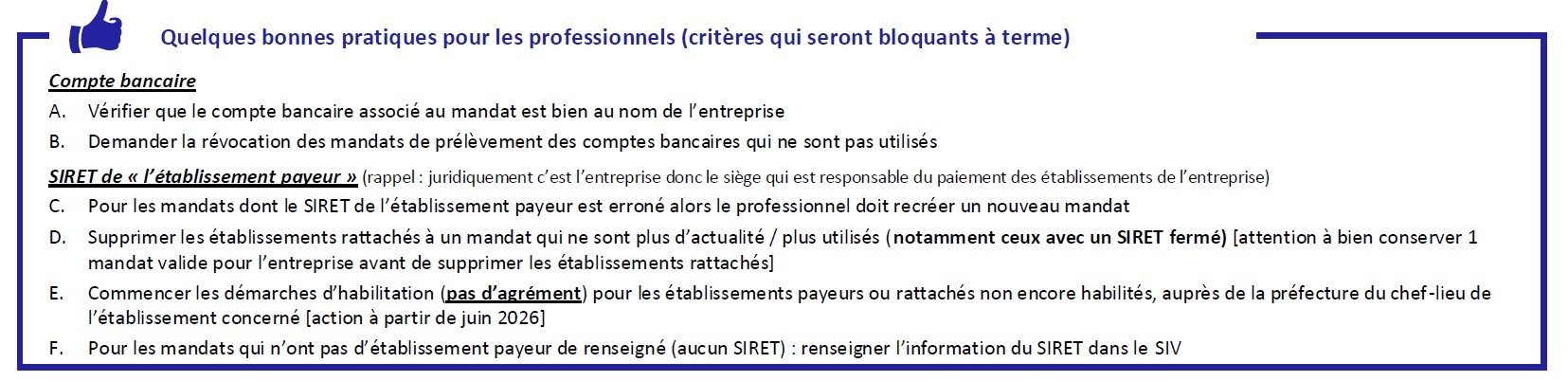 Dès la bascule (juin 2026), les mandats avec des établissements rattachés qui n’appartiennent pas à la même entreprise que l’habilité seront désactivés.