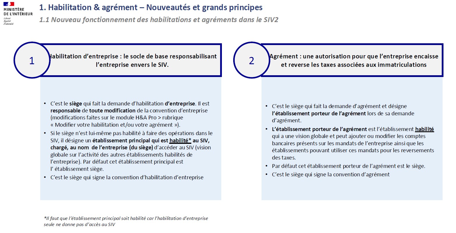 La mise en cohérence des données d’habilitation est indispensable dans le cadre de la mise en service du module « Habilitations et Agréments » en vue du SIV 2 et dans un objectif de lutte contre la fraude. A terme, l’habilitation et l’agrément SIV seront portés au niveau de l’entreprise (Siren), à charge pour cette dernière de déclarer la liste des établissements de l’entreprise (Siret) pouvant demander une habilitation.